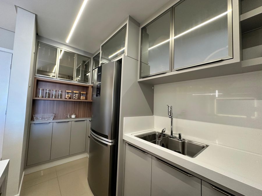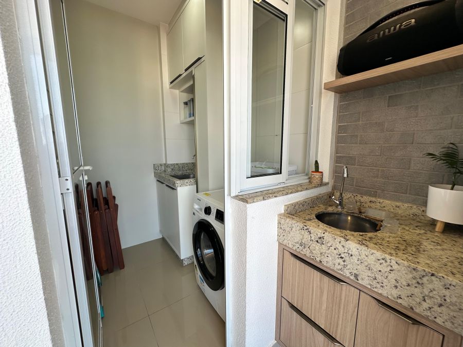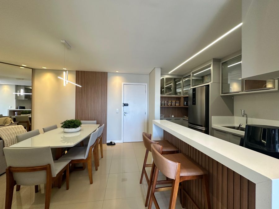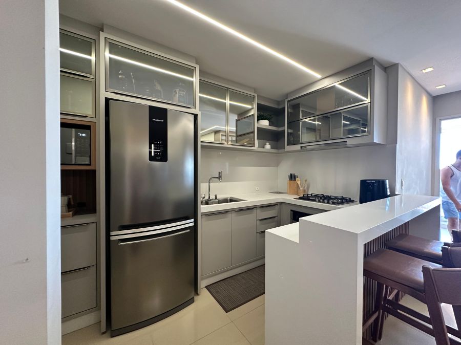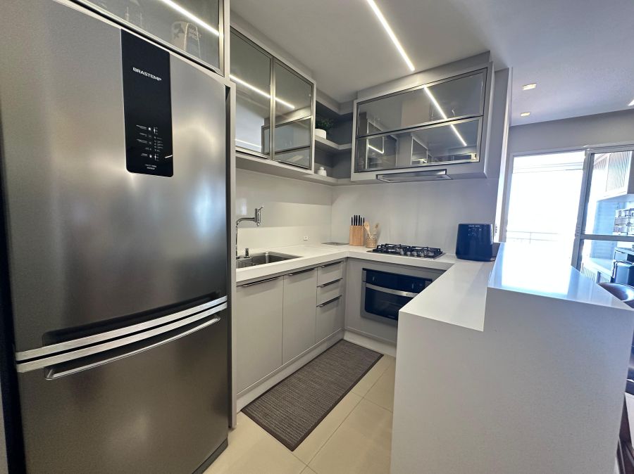 Imóvel entregue 100% mobiliado, com móveis planejados e cômodos climatizados. Conta com piso laminado nos quartos e porcelanato nas demais áreas, além de cozinha equipada, área de serviço, lavanderia e sacada com churrasqueira.